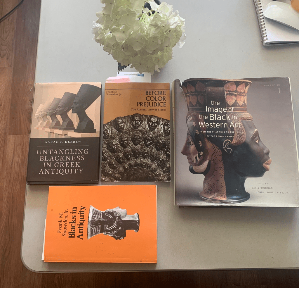 Bonus for today, as I’m in the office and can share some of the books I’m drawing on for the daily #AncientBlackness posts (we will discuss Snowden’s view of blackness as “before color prejudice”)