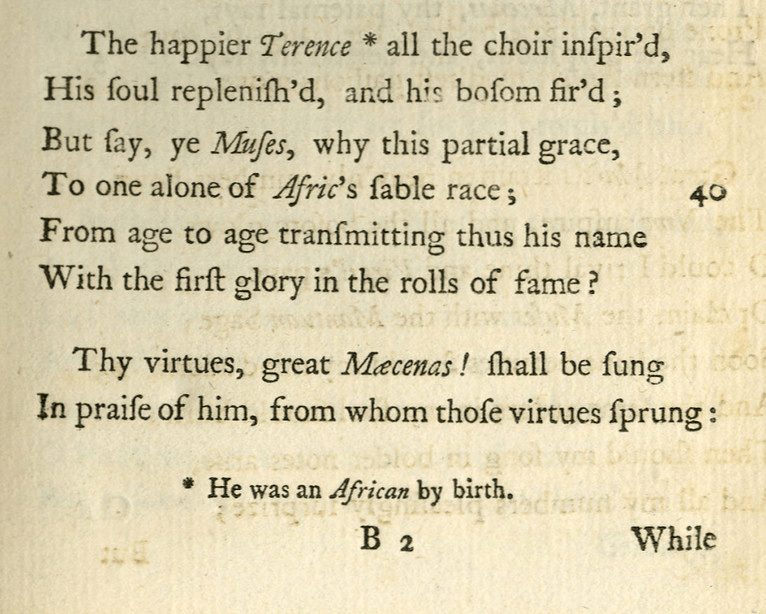 [8] Black African figures appear across Latin literature from its beginning. Plautus’ Poenulus describes Giddenis’ blackness as well as her beauty (1112-13); Terence’s Eunuchus refers to a “little slave girl from Aethiopia” (165-7); and Terence himself is described as black by Suetonius (Life 5).