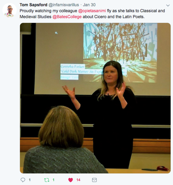 - 30th January 2020, invited speaker at Bates College; “Cicero and the Latin Poets,” [slides & handout]; 31st January 2020, “Teaching Digital Approaches to the Ciceronian Corpus.” [slides & handout]