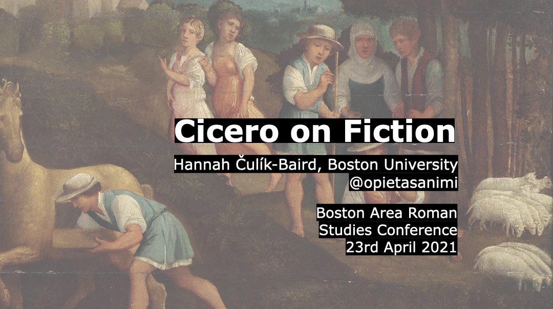 - 23rd April 2021, “Cicero on Fiction,” at the 26th Annual Meeting of the Boston Area Roman Studies Conference (via zoom), alongside Diana Spencer (“Varro’s strategies of quotation in De Lingua Latina“), and Katharina Volk (“Necromancers in the Senate”)
